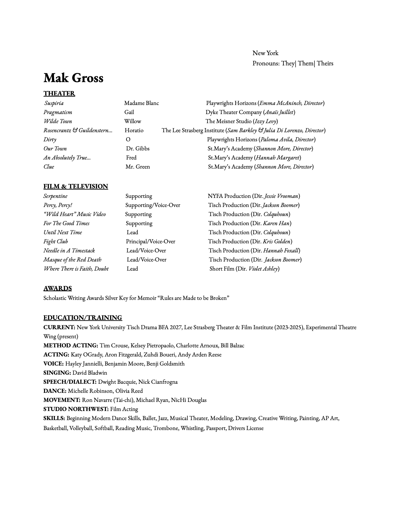 Mak Gross is an actor based in New York currently pursuing a B.F.A in Drama from NYU Tisch School of the Arts. They began their formal acting training at the Lee Strasberg Theatre & Film Institute in Fall 2023 and continue their studies at The Experimental Theatre Wing as of Fall 2025. They thrive both on stage and behind the camera, with a strong affinity for awkward humor, deeply earnest characters, and truthful storytelling.